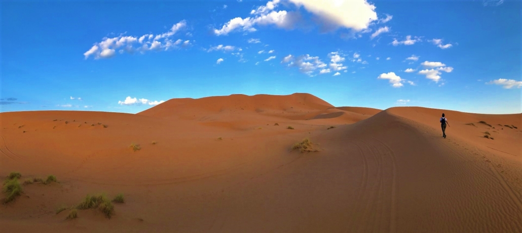 Merzouga, qui la strada finisce! Dopo circa 8 ore di auto da Marrakech, inizia il deserto del Sahara che incontrastato e silenzioso domina il paesaggio fino ai confini con l’Algeria. È da qui che in groppa ad un cammello (che nella maggior parte dei casi è un dromedario) è possibile raggiungere il centro del deserto fino ai vari accampamenti lontani da ogni forma di civiltà.